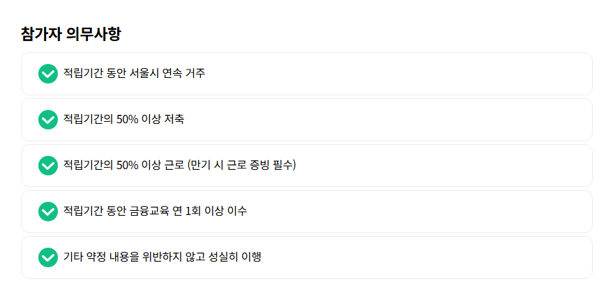 - 중도 해지 시, 서울시 지원금 지급되지 않음 — 반드시 만기까지 유지해야 전액 수령 가능